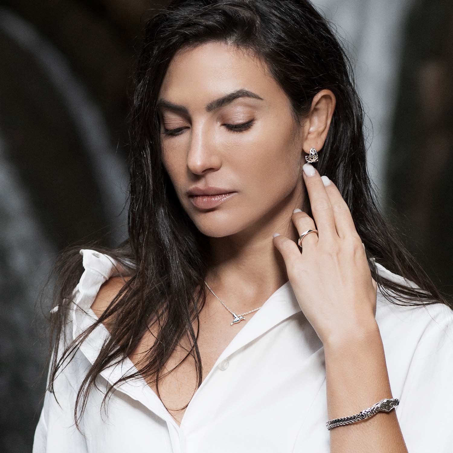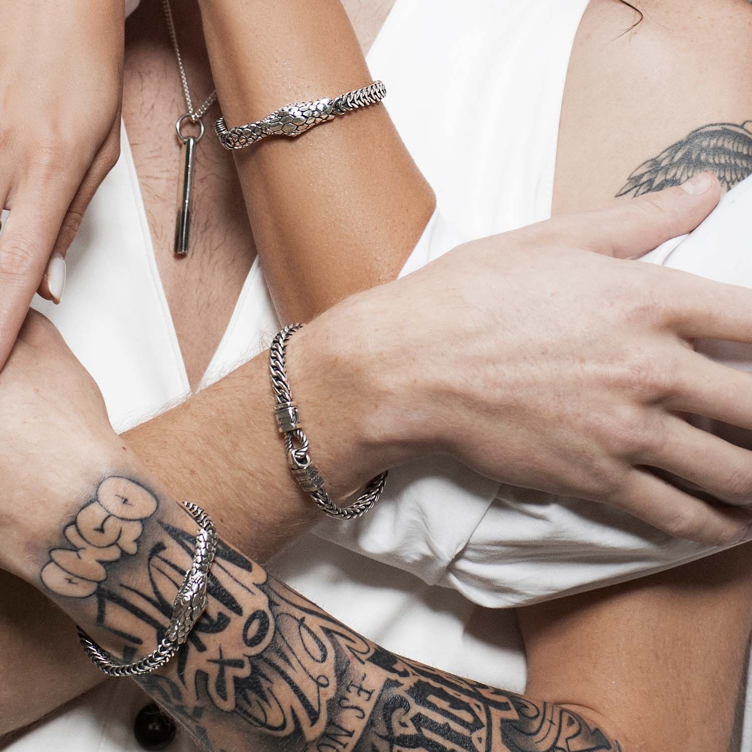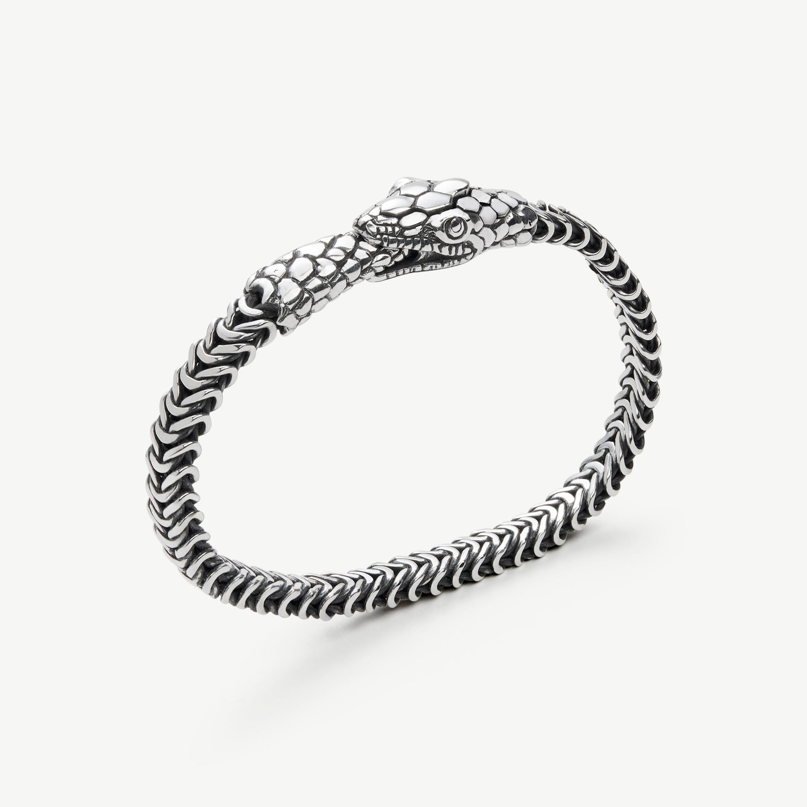 The Ouroboros bracelet features a stunning hand-woven silver chain adorned with a uniquely crafted snake-head closure. To fasten the bracelet, the end of the chain is cleverly threaded into the serpent’s mouth, creating the illusion that it is biting its own tail. This closure perfectly encapsulates the symbol of regeneration and completeness, seamlessly merging aesthetic beauty with profound meaning.