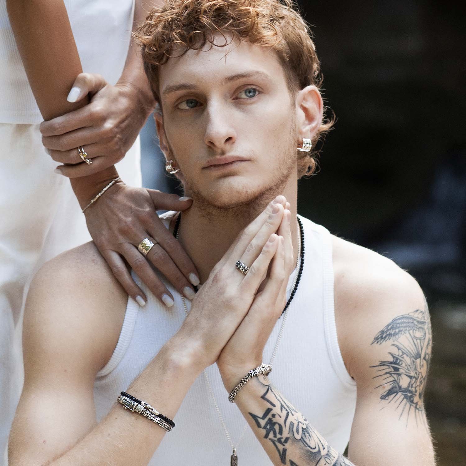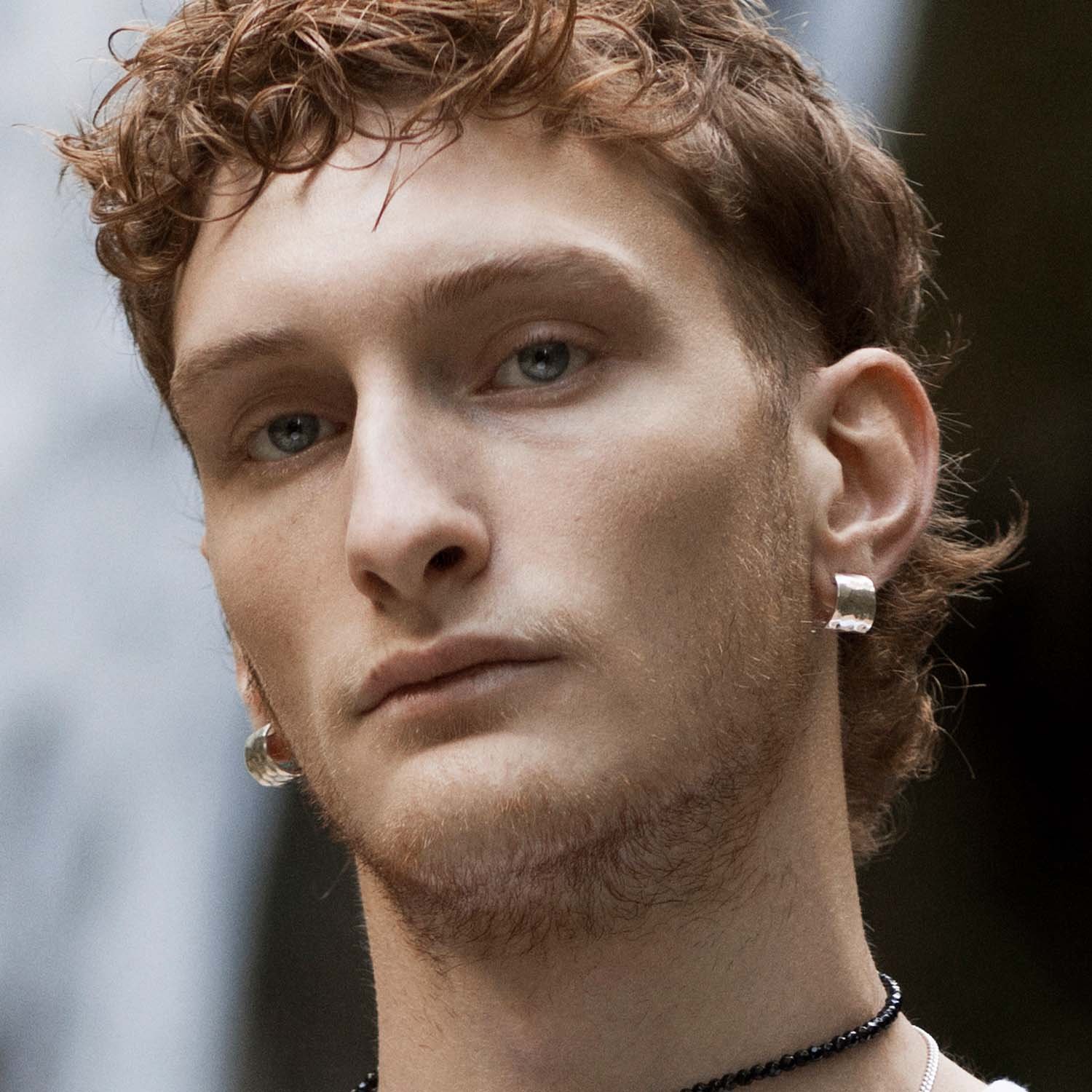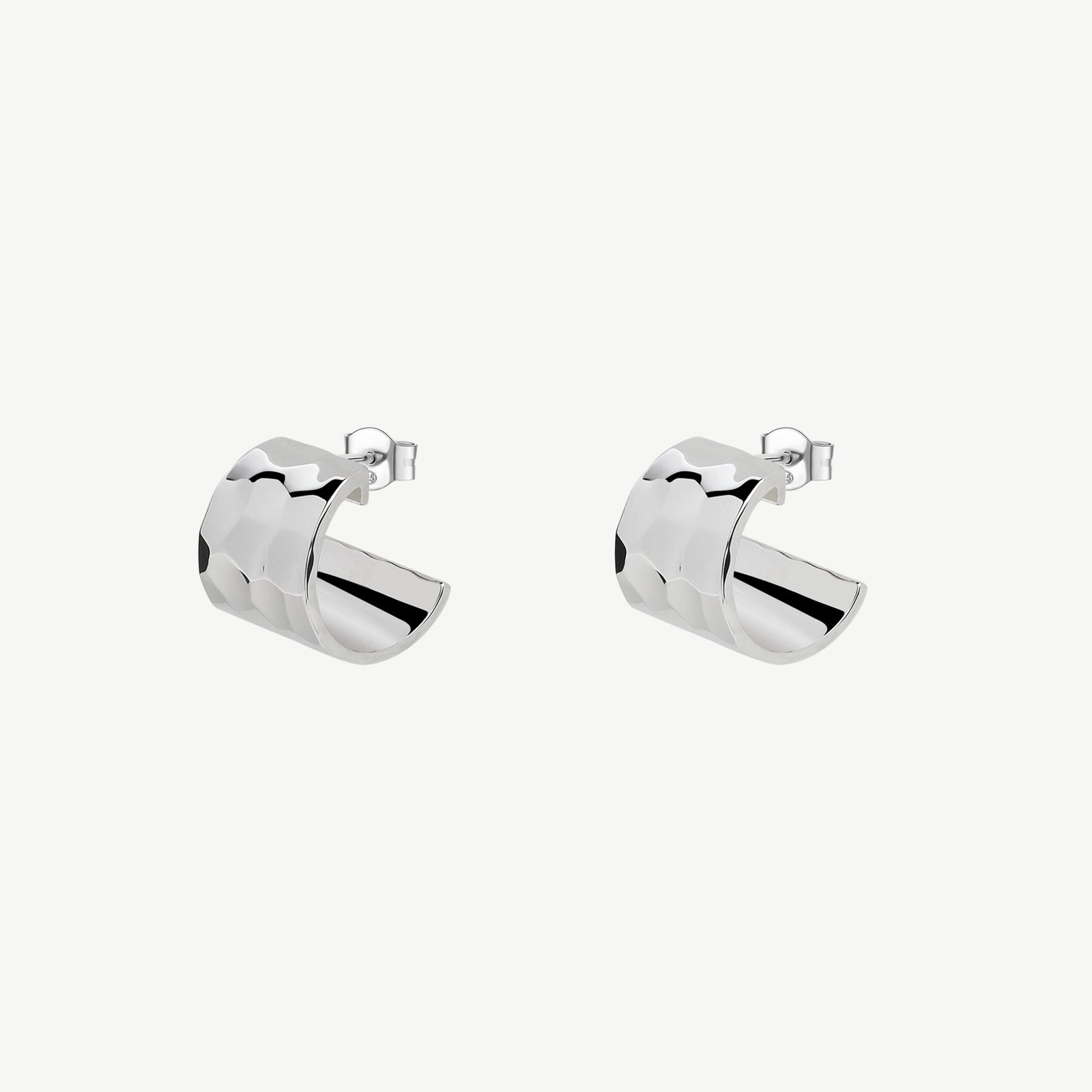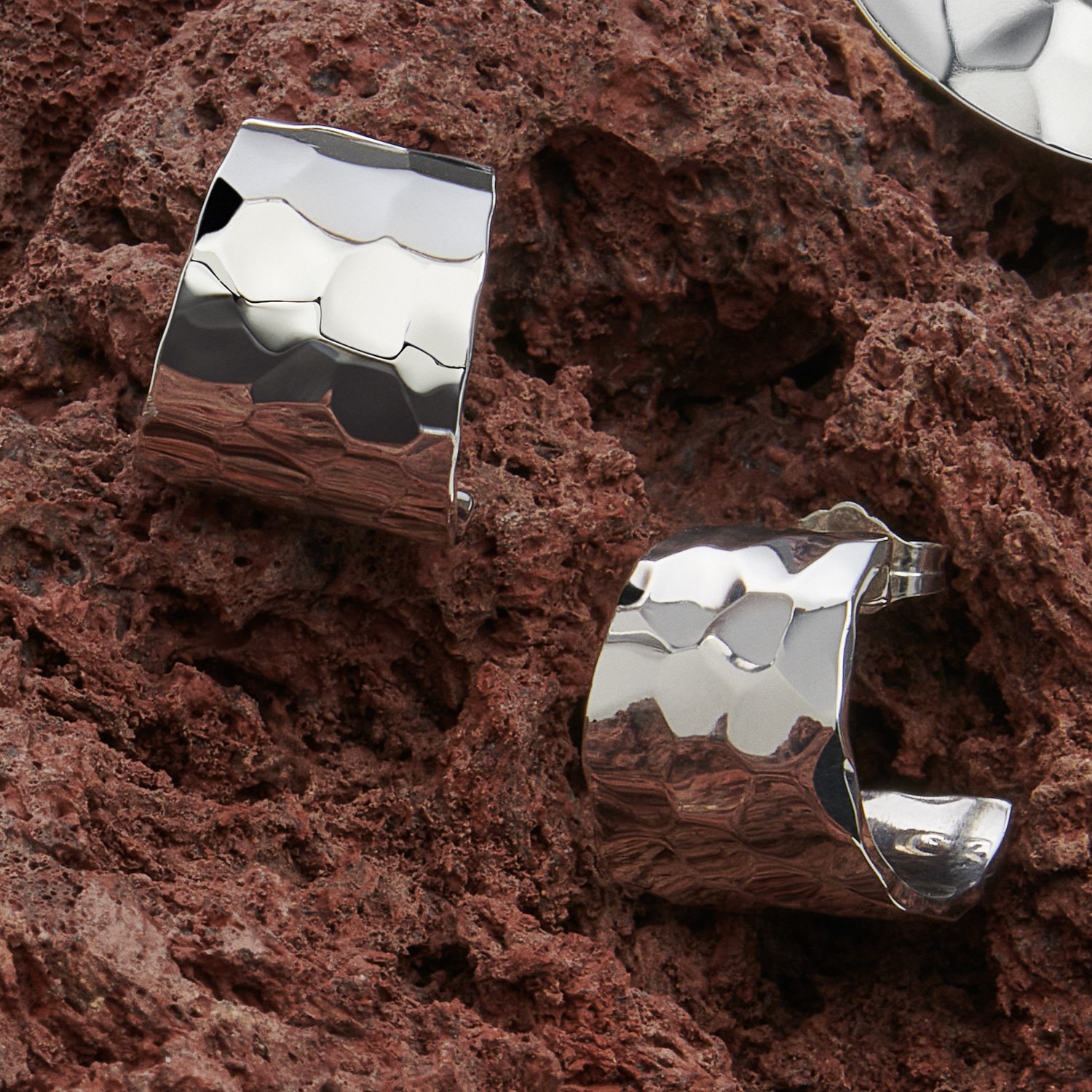 The small ear cuff, characterised by its swirling design, gracefully envelops the ear with a soft, sinuous line. The hammered surface subtly captures light and brings forth dynamic reflections akin to those created on water’s surface by a gentle breeze.