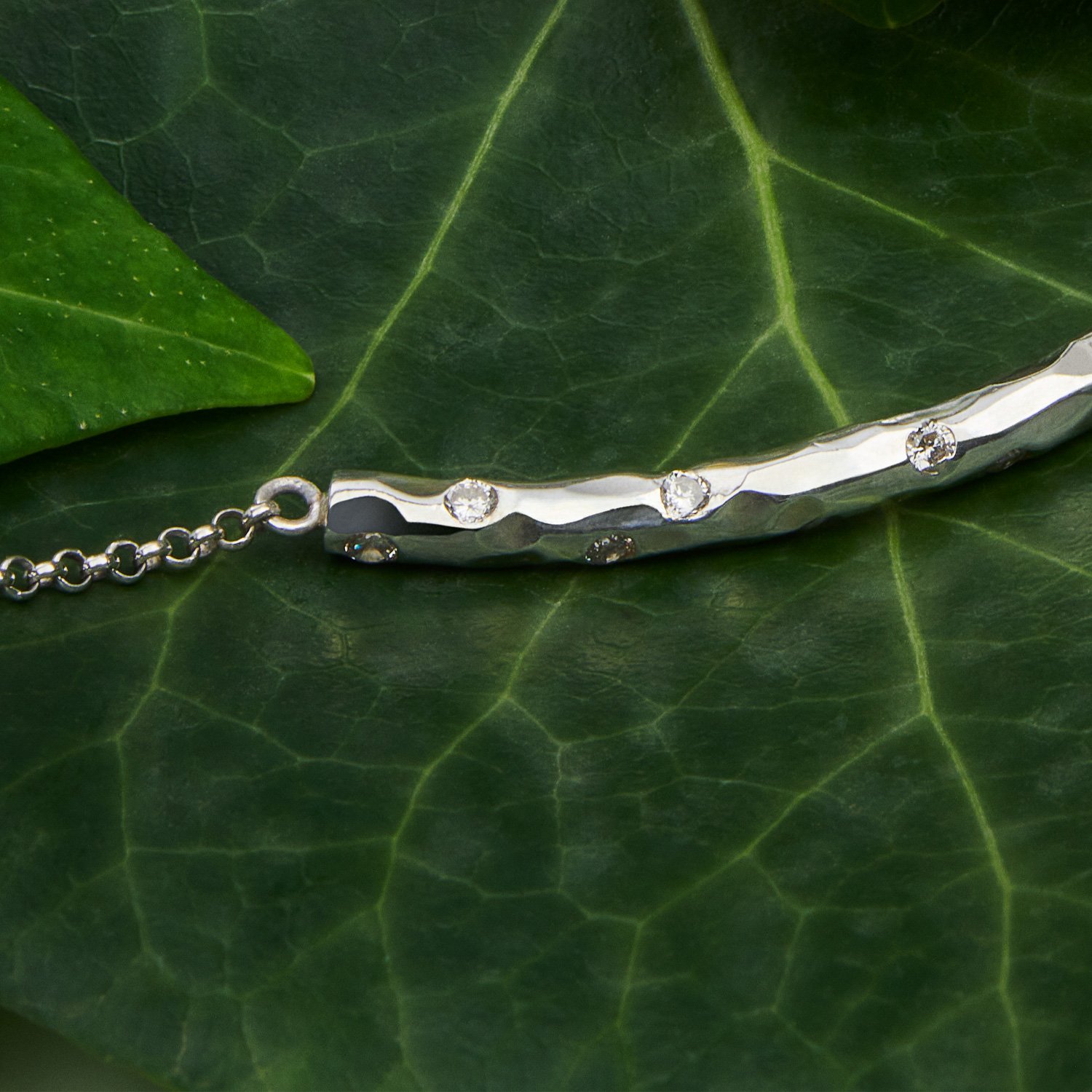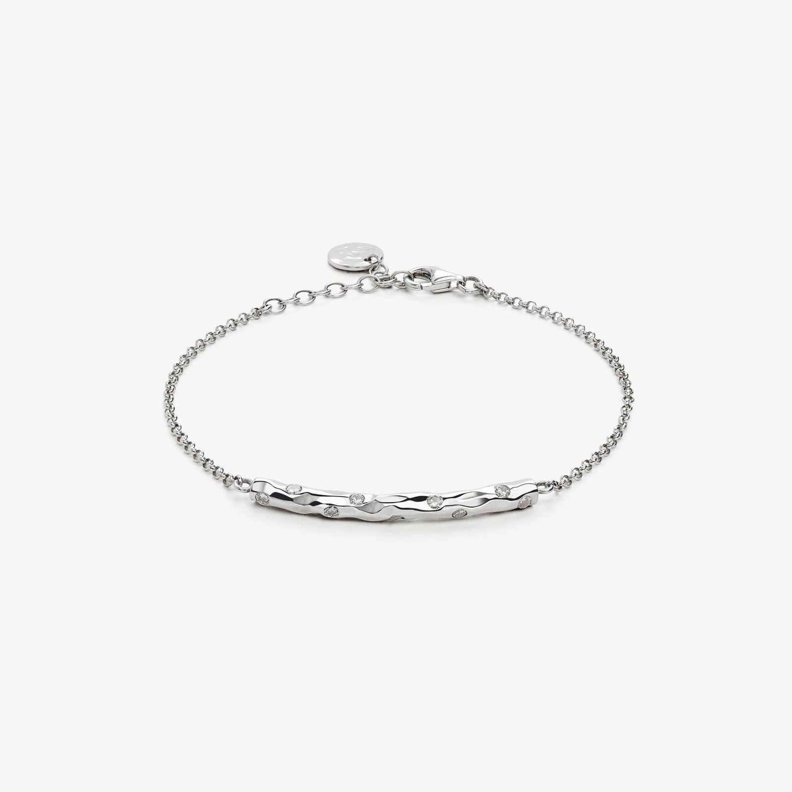 The “Sparks” bracelet is a harmonious blend of a delicate silver chain and a hammered central bar, adorned with white zirconia stones arranged with artistic spontaneity, embodying sparks of light.