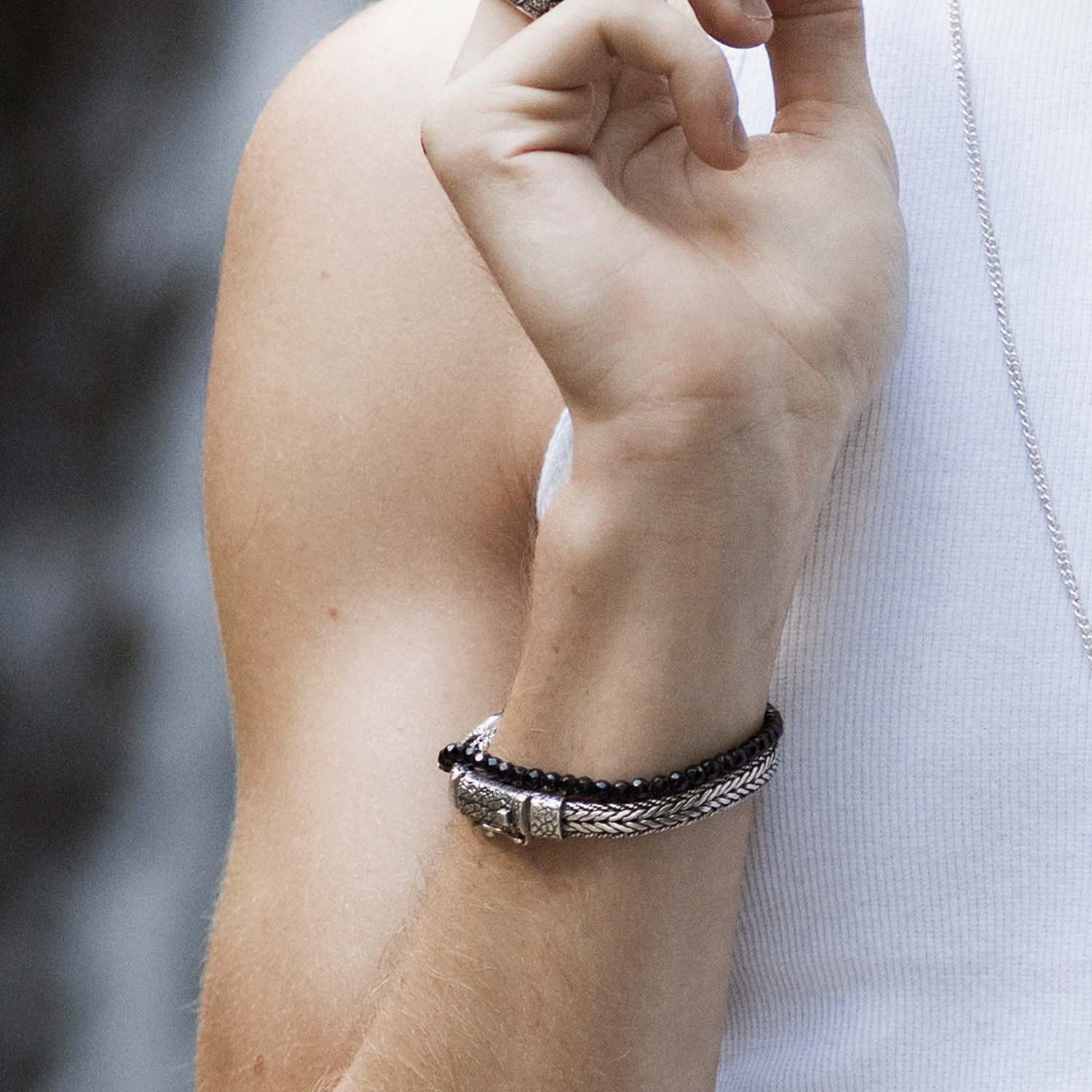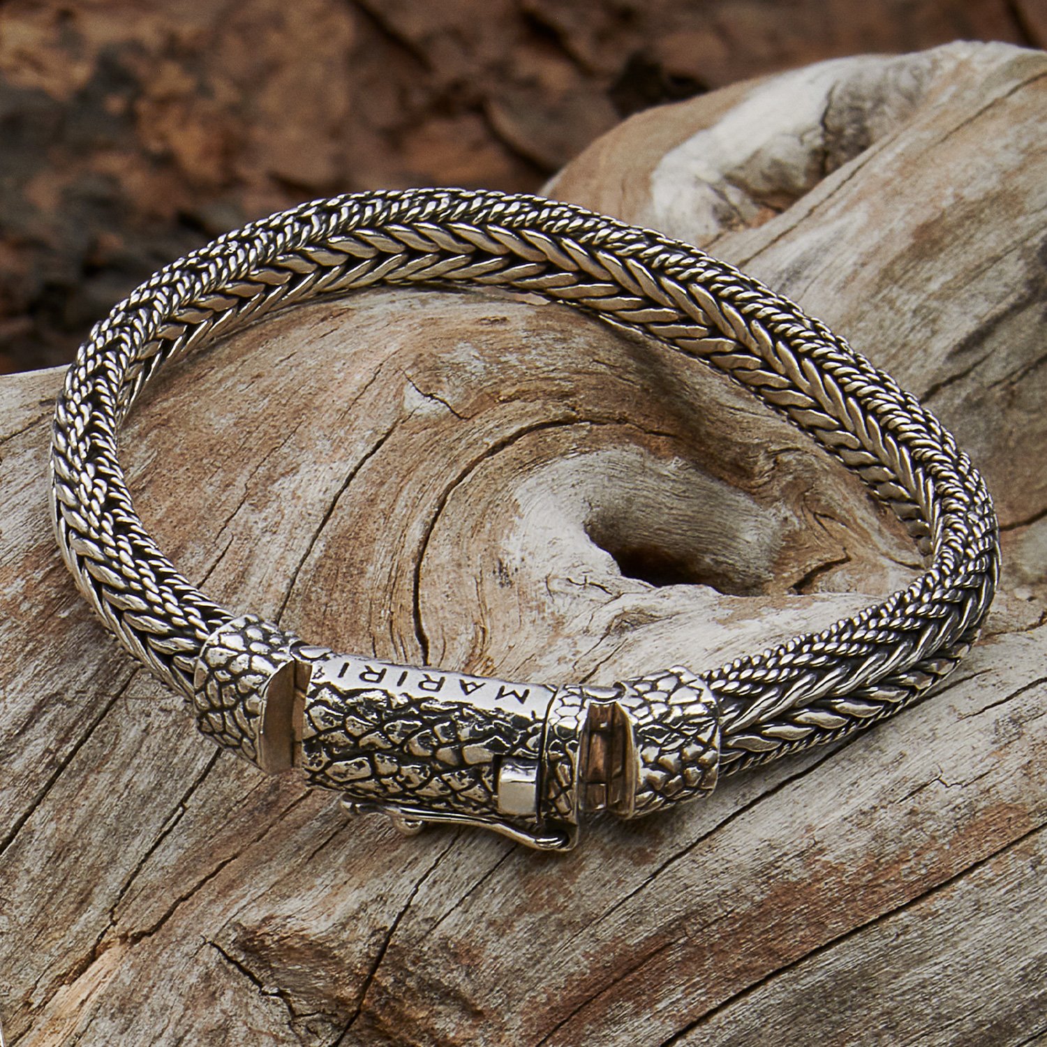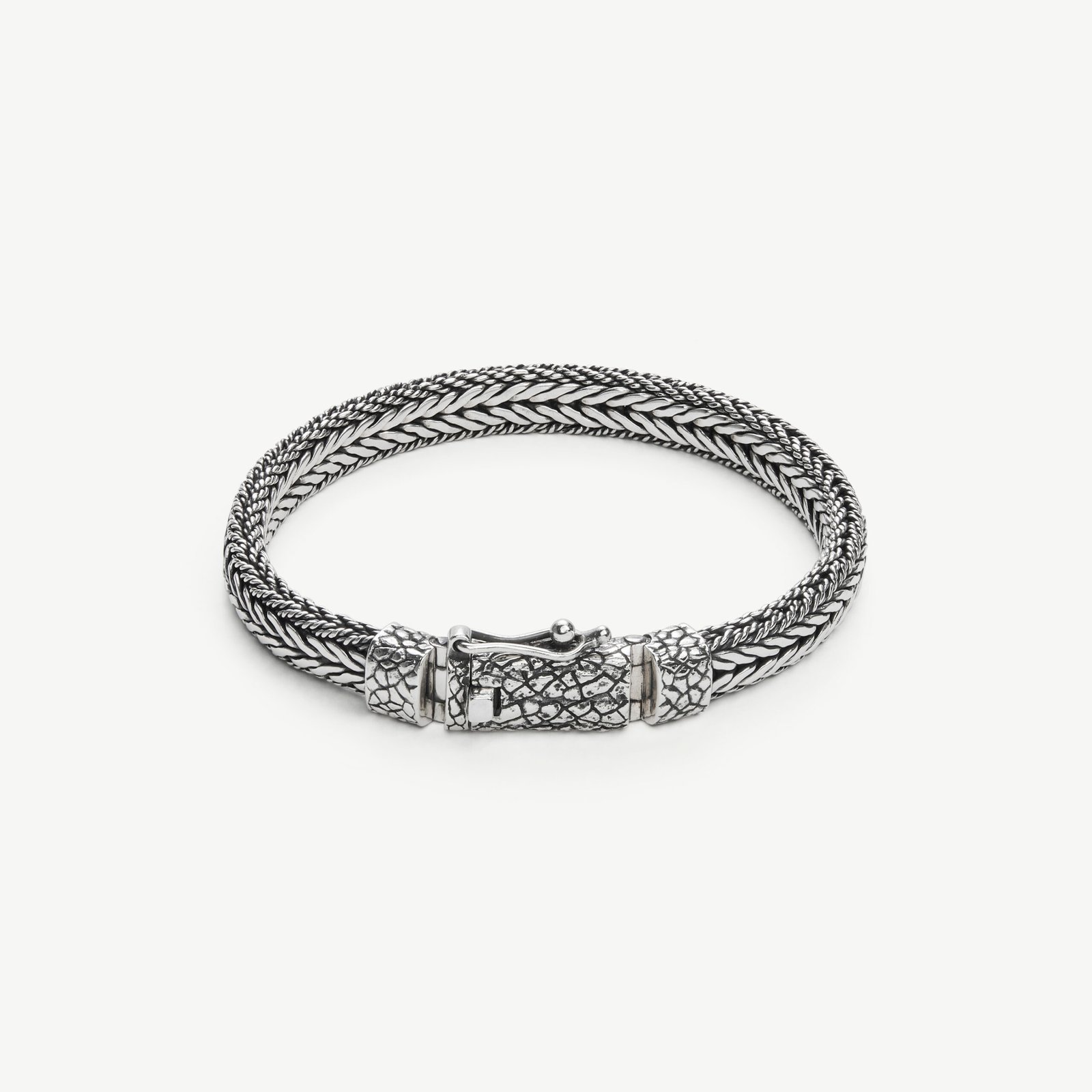 Crafted with exquisite skill, the “Terra” bracelet showcases a stunning hand-woven silver chain, where each link is flawlessly shaped to create a dynamic pattern that exudes movement. The essential yet refined closure features a unique texture reminiscent of arid earth, tactile and visually organic.