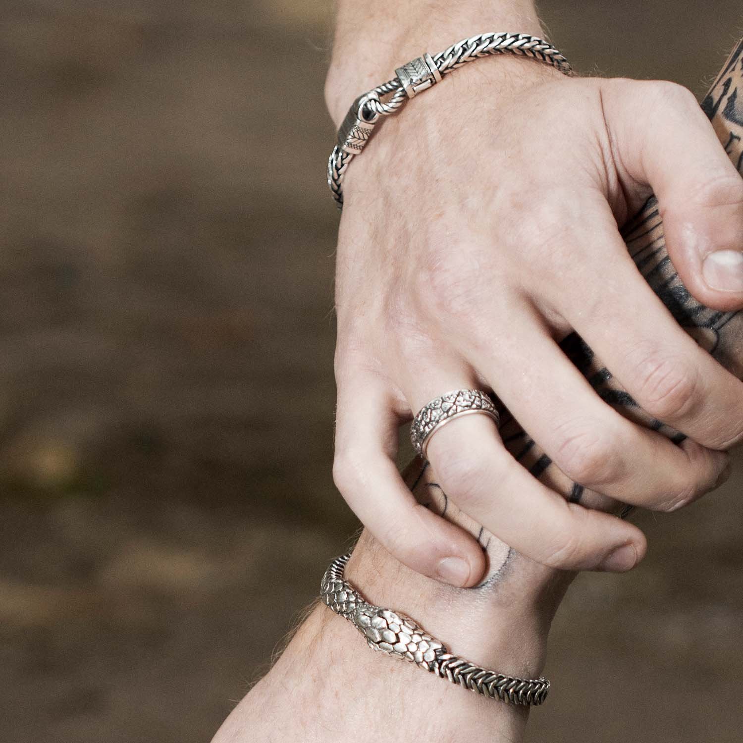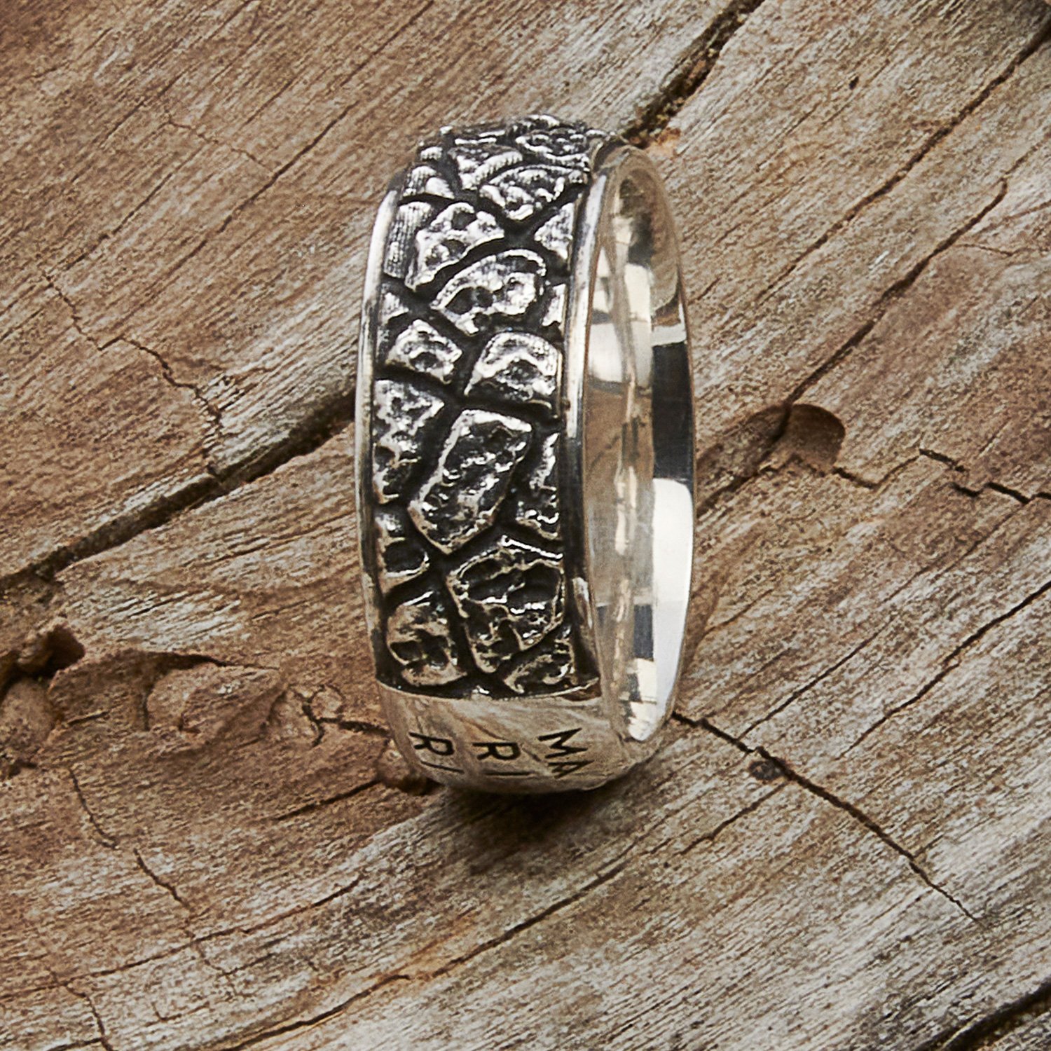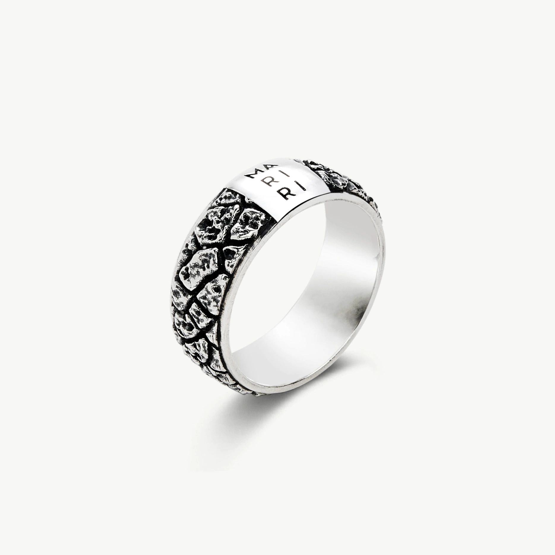 The “Terra” ring embraces the finger with a gentle, rounded form. Its surface is adorned with a rich texture that mimics the appearance of parched land, complete with three-dimensional details replicating natural crevices and grooves. These elements provide the ring with a raw, organic beauty, as though it were sculpted by nature itself. The inner profile is thoughtfully bombed for a consistently comfortable fit.